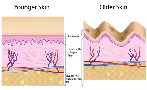 Младата кожа има плътна дерма, богата мрежа от колагенови и еластинови нишки (тъканта, която поддържа кожата). С напредването на възрастта, колагеновите влакна се разреждат и увреждат и способността им да поддържат кожата намалява. Това води до увисване на кожата и поява на бръчки.
