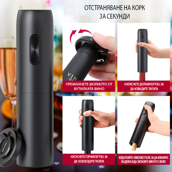 Нашата електрическа отварачка за вино е не само функционално, но и стилно допълнение към вашата кухня или бар, с дизайн, който е едновременно модерен и елегантен.