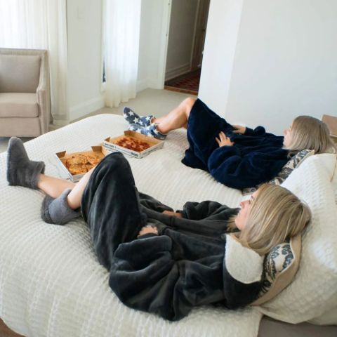 Дълъг чак до коляното – пуловерът с качулка и одеяло в едно HOODZIE – ще ви топли приятно, докато гледате телевизия, четете или си почивате следобед.