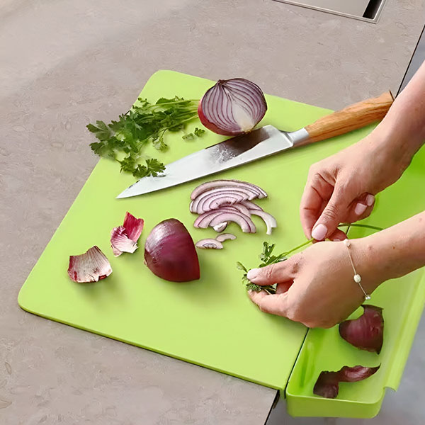 Поддържайте кухнята си подредена и ефективна! 🍅🍴 В подвижния контейнер на тази дъска за рязане се събират всички нарязани съставки, което улеснява приготвянето на храната и спестява време за почистване. 🧽✨ Кажете сбогом на бъркотията на плота!